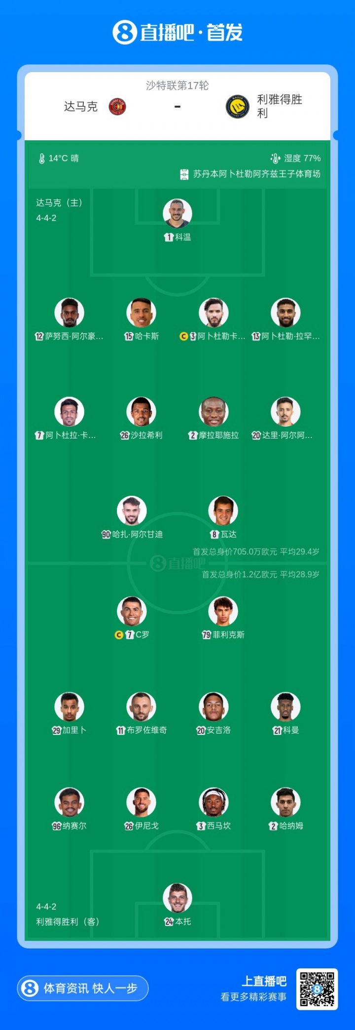 利雅得胜利首发:24-本托、3-西马坎、26-伊尼戈、96-纳赛尔、2-哈纳姆、20-安吉洛、11-布罗佐维奇、21-科曼、29-加里卜、79-菲利克斯、7-C罗