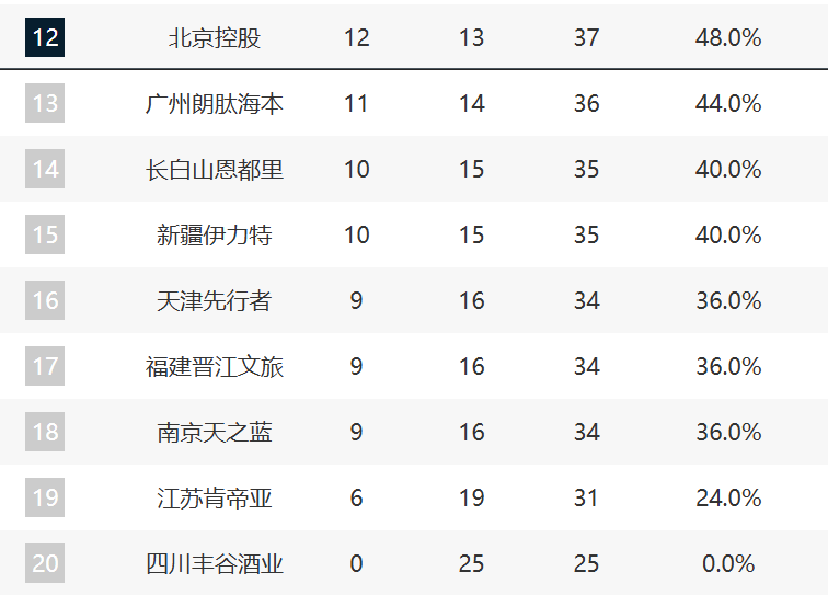 北控则巩固住了第12的位置,这轮他们击败了天津,并且领先第13的广州一个胜场。现在广州已经两连败了,他们要抓紧点了。